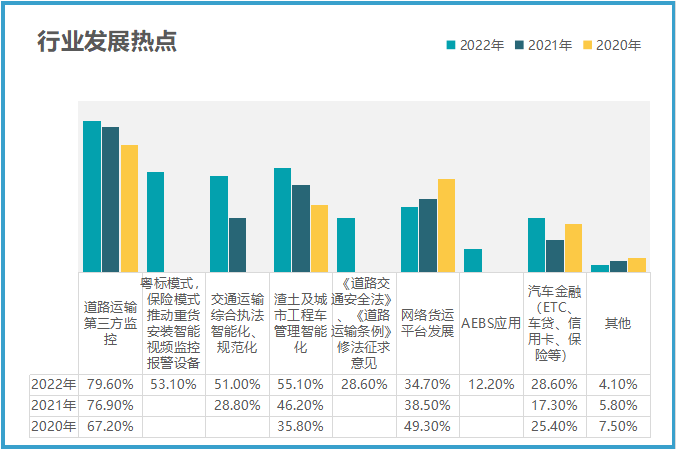 2021年,在行业发展热点的关注度中,道路运输第三方监控遥遥领先,稳居第一位,不过也不意外,从近三年的数据来看,道路运输第三方监控一直备受关注;从公开新闻和招投标情况来看,第三方安全监控平台出现频率也在增高。但就目前来说,第三方安全监控平台的发展虽有蓬勃之势,但总体还是处在无序化发展的状态,不少平台还是换汤不换药,提供的服务还停留在表面,还是通过政府管理或者规模优势来获得市场、利润。总的来说,第三方安全监控平台商业模式的多样化也需要时间来培育。