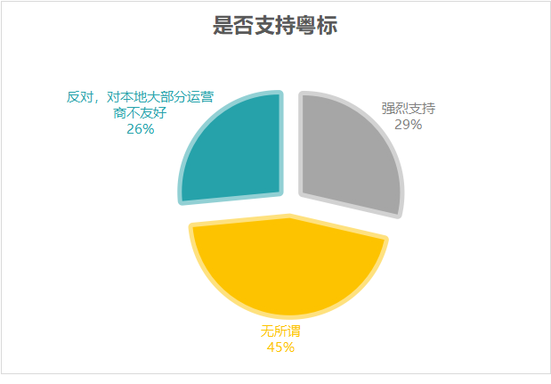 调查结果显示,29%的运营商强烈支持粤标模式,不过支持与反对的声音几乎持平,有26%的运营商反对“粤标”模式,认为其对本地大部分运营商不友好,剩下的45%则表示无所谓,应是持观望态度,反正火还没烧到自家。