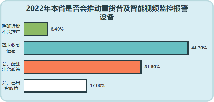 2021年广东完成了30万台重货安装主动安全报警设备的工作,2022年其他省市是否会跟进安装工作是现阶段设备市场关注的重点。根据调查结果,只有少数运营商表示近期本省不会有推动动作,但,几乎可以肯定重货普及智能视频监控报警设备势在必行,只是时间问题。目前,福建、河北、南宁等省市已经开展了相关试点工作。