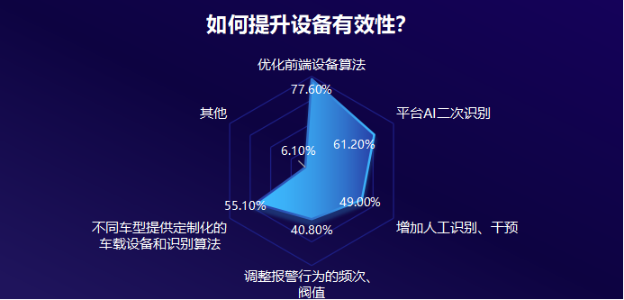 预警的有效性是这两年智能视频监控报警设备应用讨论较多的问题,报警次数太多,无效报警较多以及报警次数太少,都是让人头疼不已的问题。那么,该如何提升视频监测报警数据的有效性呢?可以通过优化前端设备算法,增强平台AI二次识别,增加人工识别、干预,调整报警行为的频次、阀值,不同车型提供定制化的车载设备和识别算法等手段提升设备报警数据的有效性。行业目前最希望看到的应该是行管部门出台关于智能视频监控报警的统一管理规范、标准,对需要报警的行为进行细分、明确,对于达到报警的行为过程加以规范,营造良好的道路运输环境。