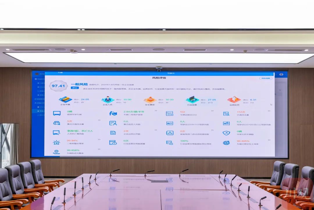 风险评估则分为“企业车辆”“企业人员”“安全事故”“行业监管”4个大类,每个类别都有应得分和实得分。4个大类的得分,又分别由重点交通违法量、企业运政处罚数、电子运单异常率等小项组成。从总分来看,这家企业得分97.42,评估等级为“低风险”。
