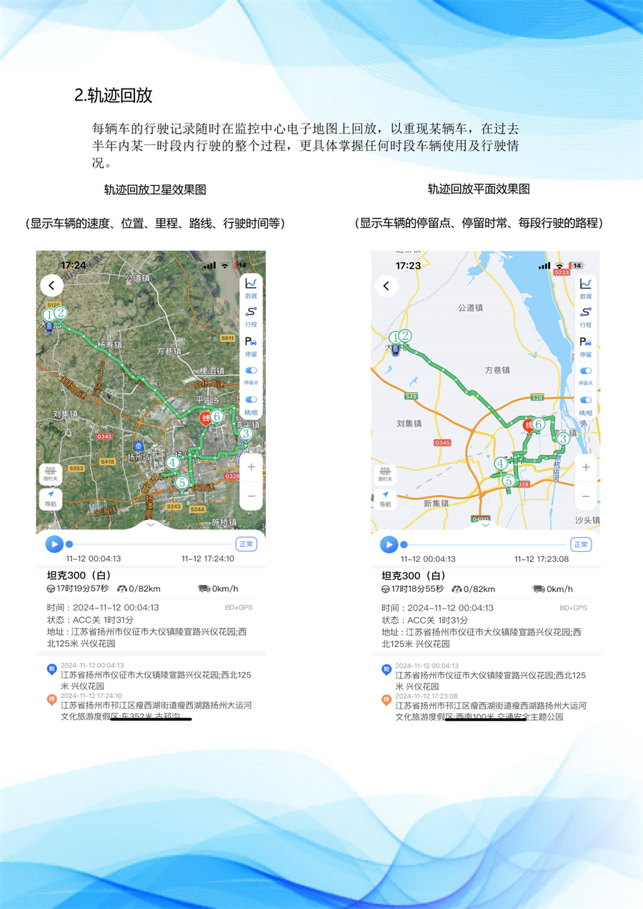 每辆车的行驶记录随时在监控中心电子地图上回放,以重现某辆车,在过去半年内某一时段内行驶的整个过程,更具体掌握任何时段车辆使用及行驶情况。