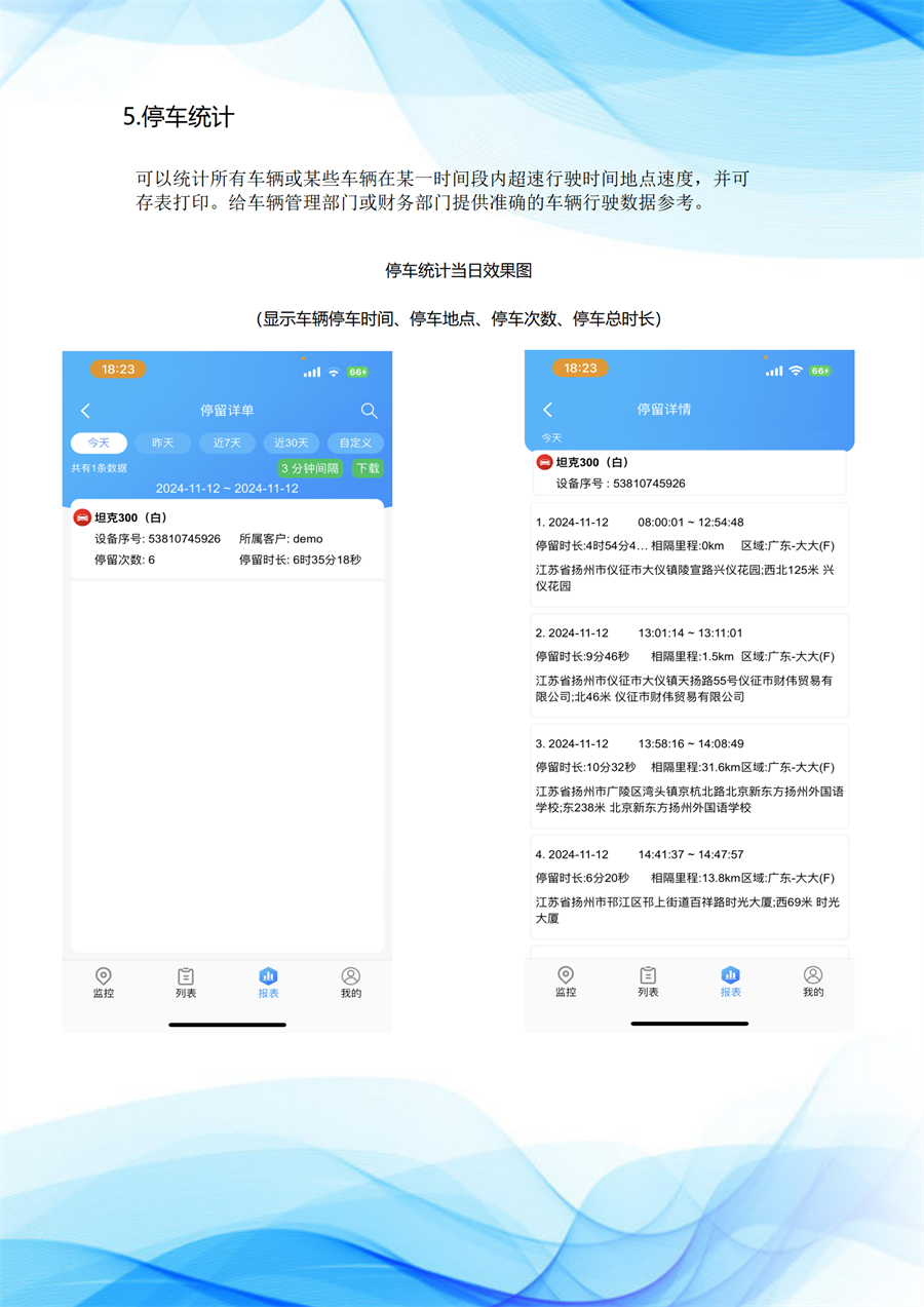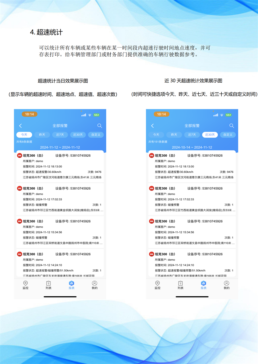 3.报表丰富,里程统计,超速报警,断电报警,拆除报警,电瓶低电报警等。